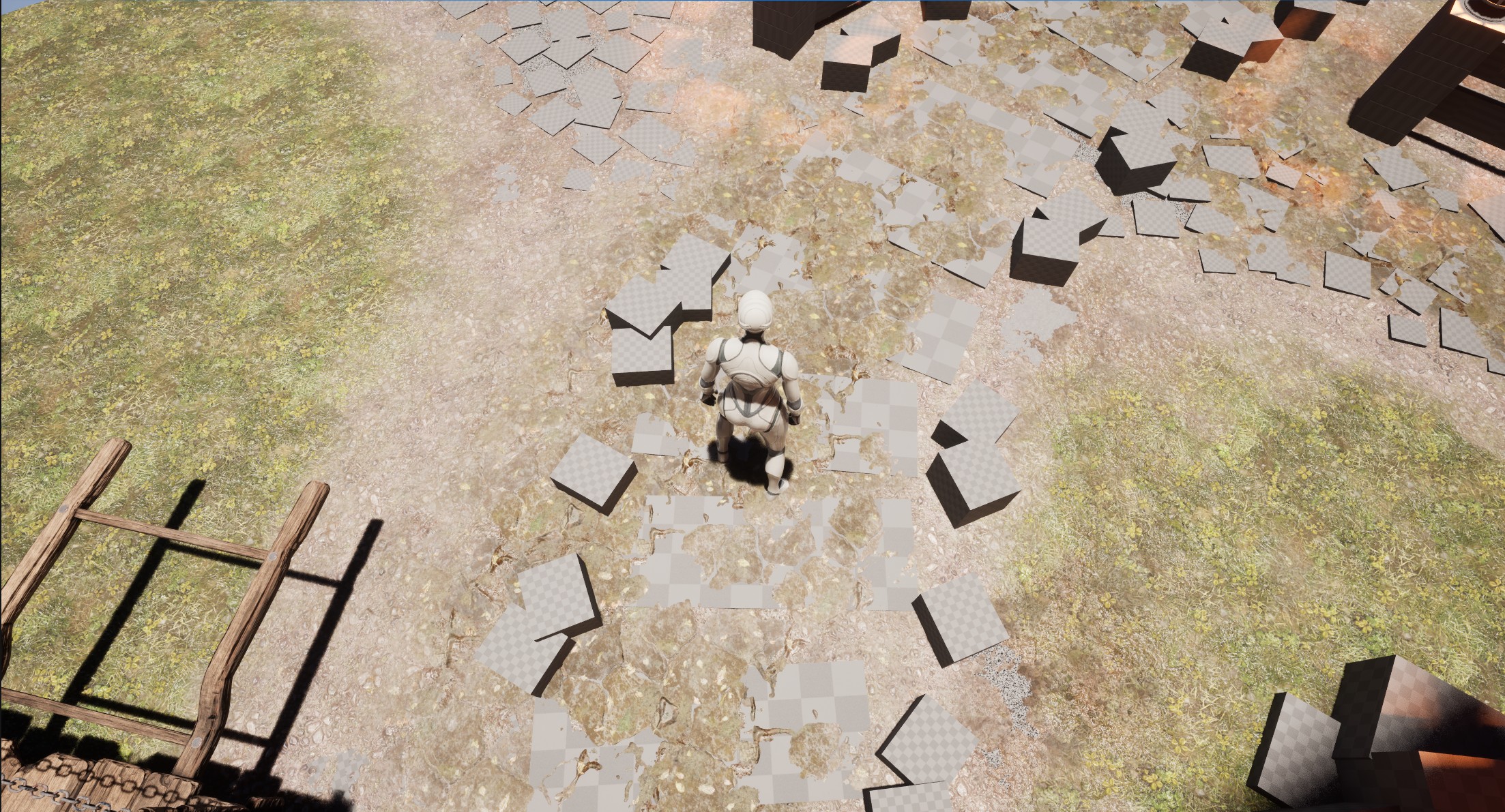 For blending I used the same master material from the terrain, but added World Aligned Texture to ensure brick continuity across different wall modules.
