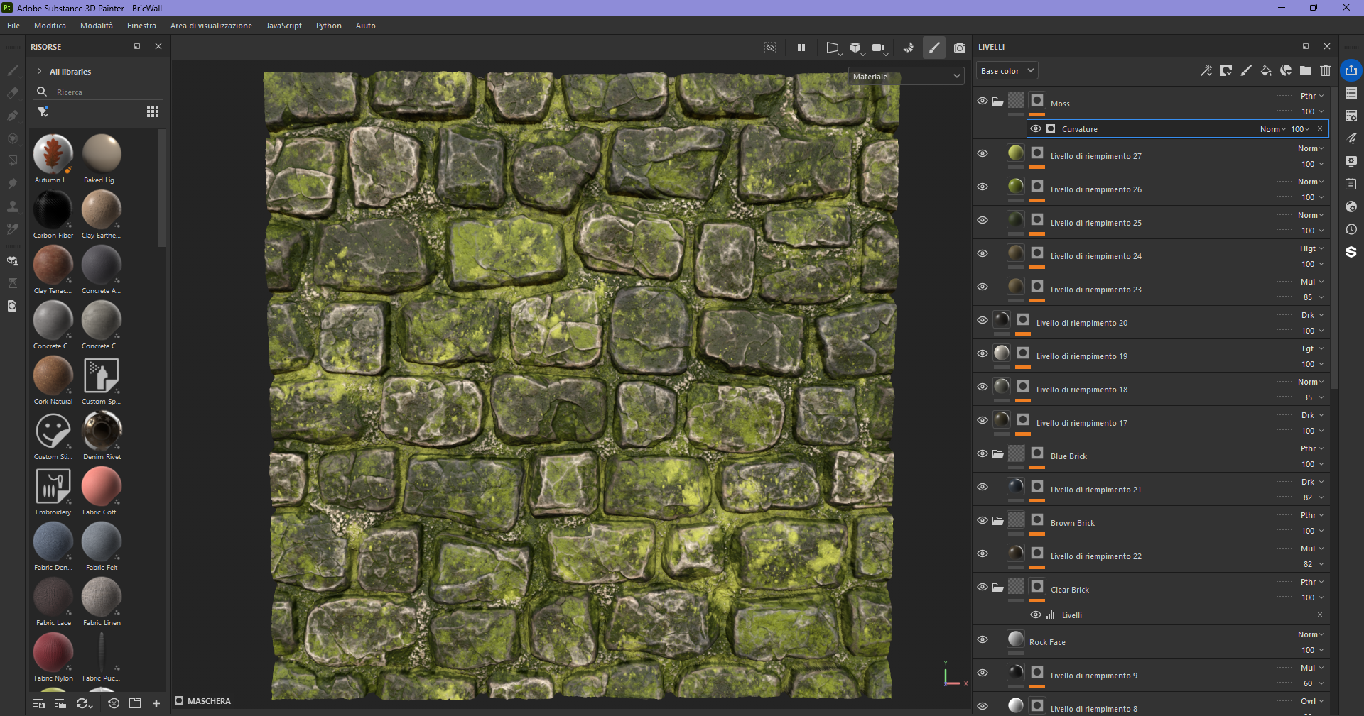 In Substance Painter I did the bake and prepared two materials: one for clean, dry bricks, and another for damp areas with moss and algae that grow where it's always shady and humid.