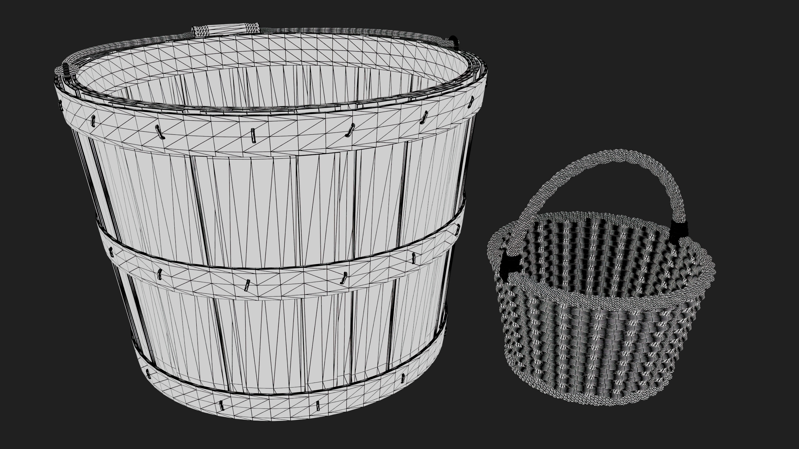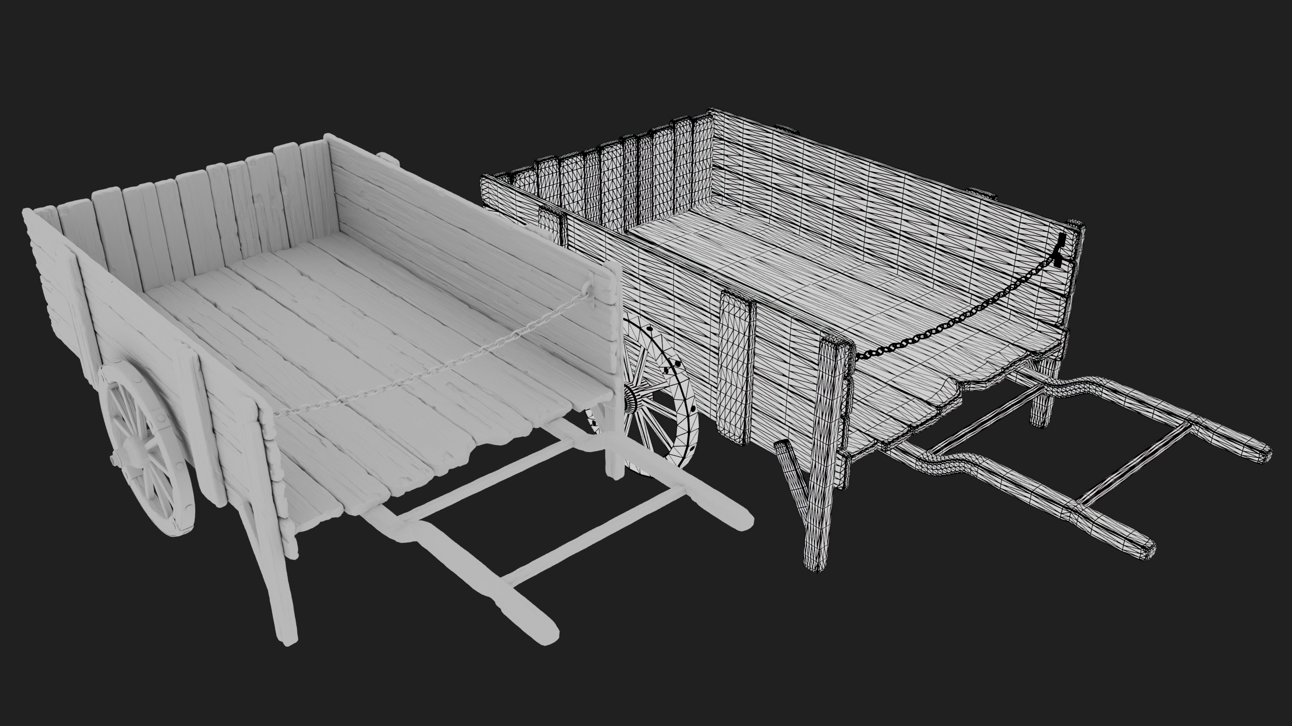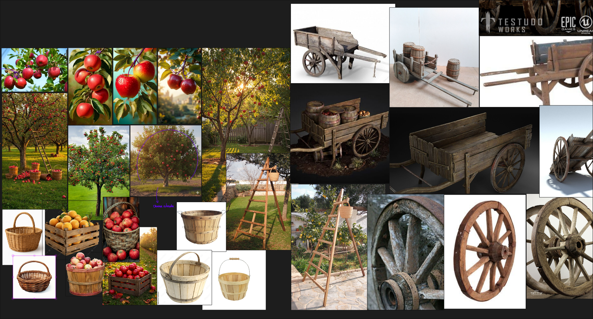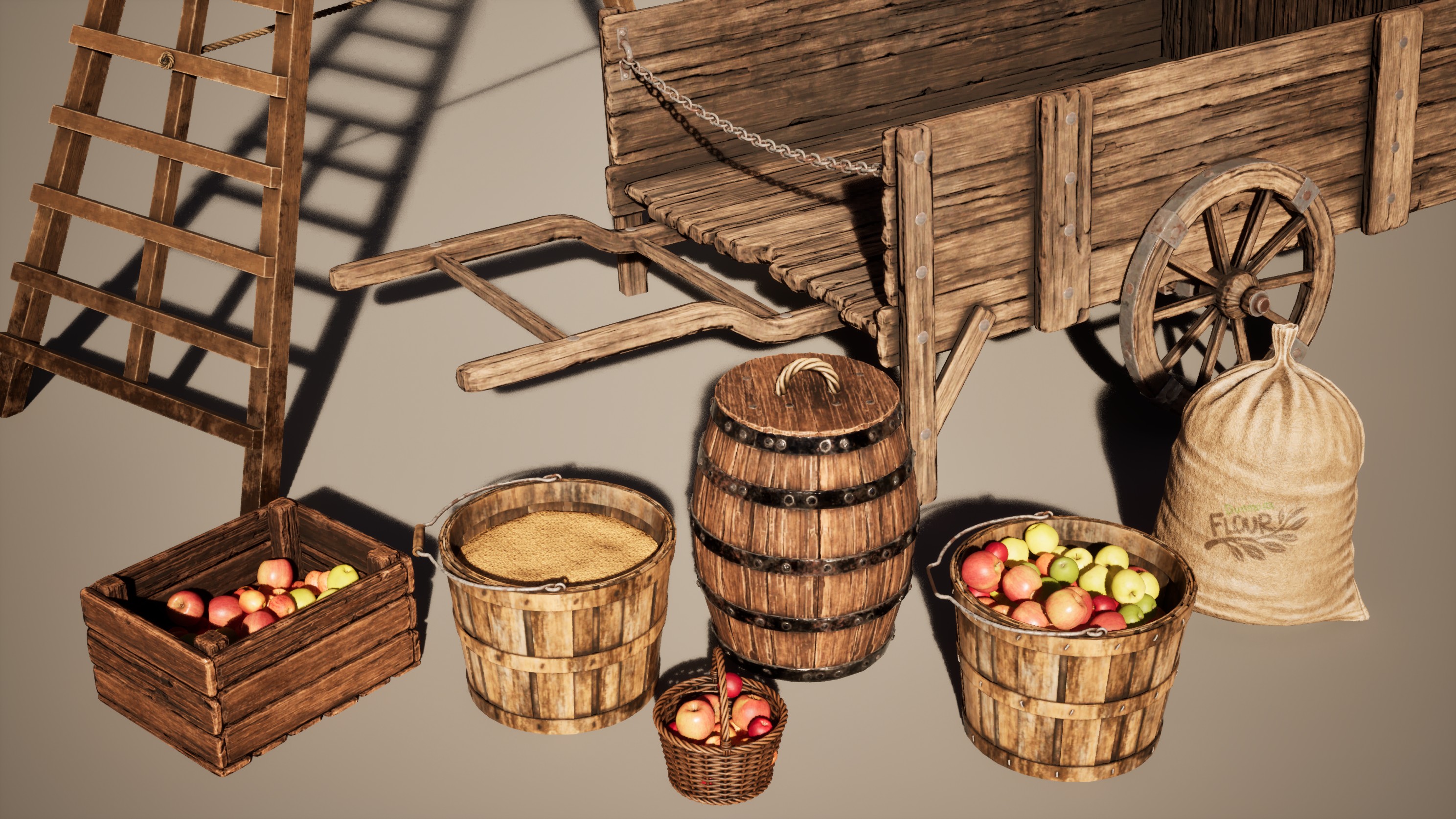 The props (cart, barrels, crates, ladder, baskets):