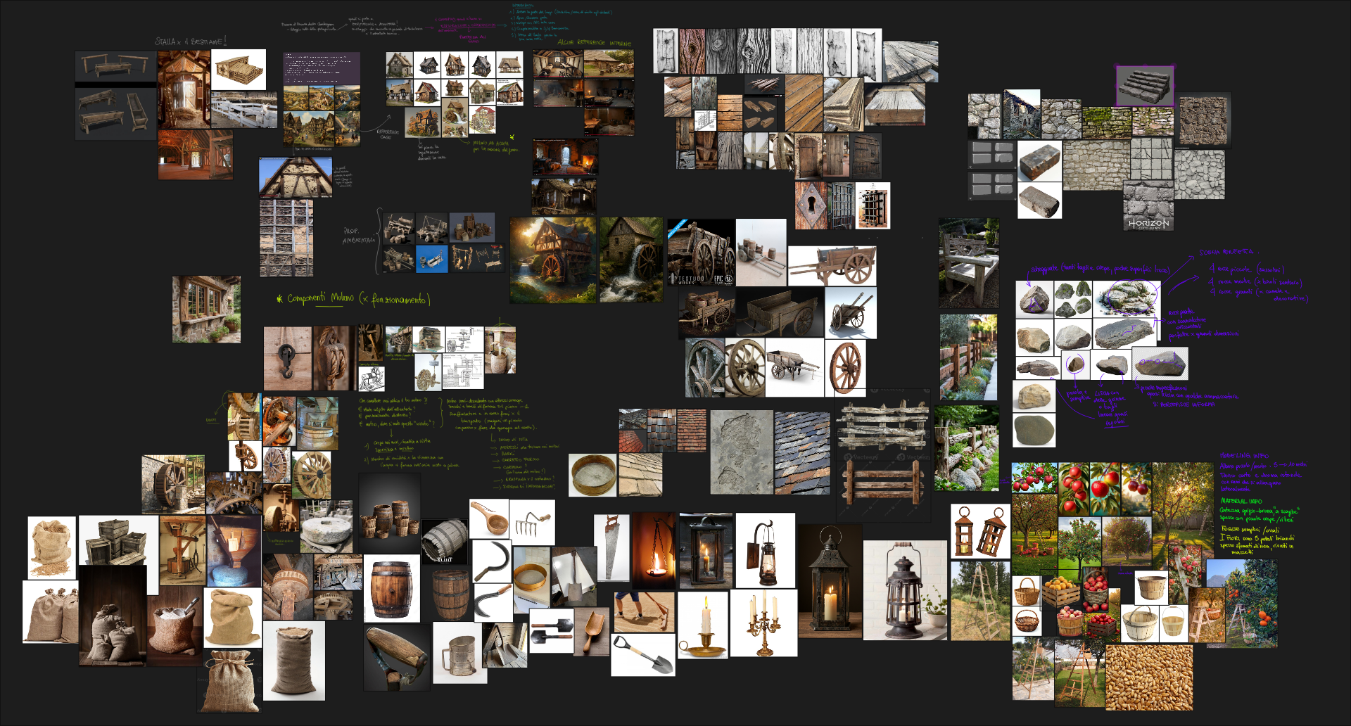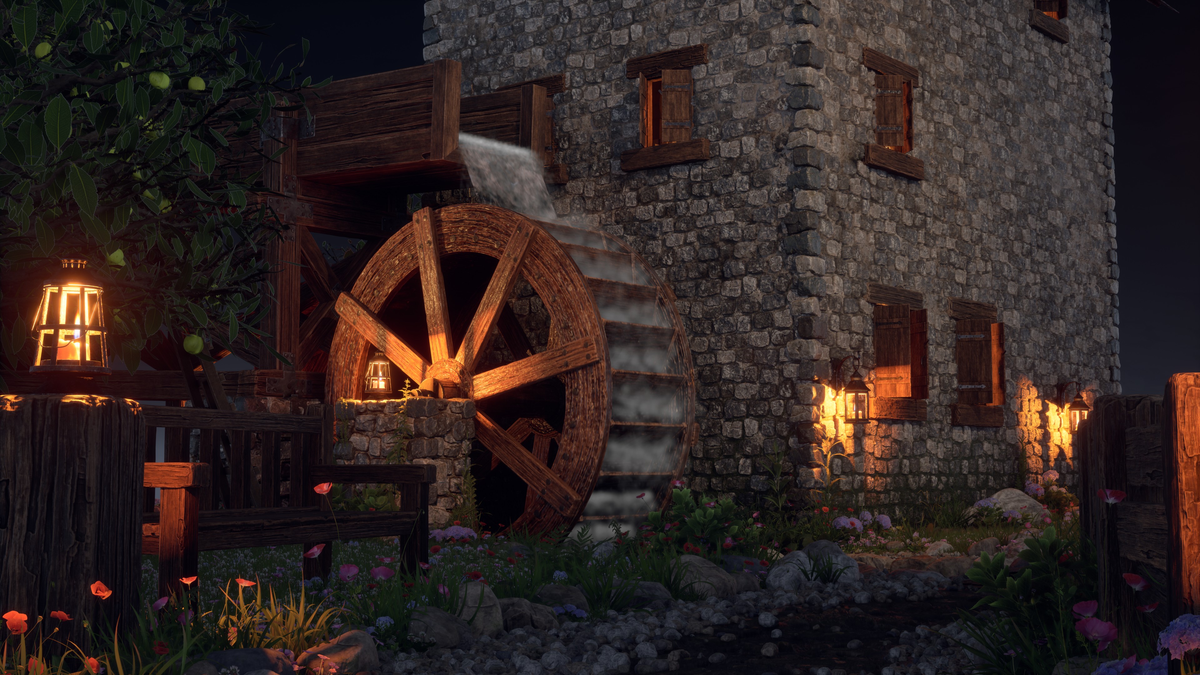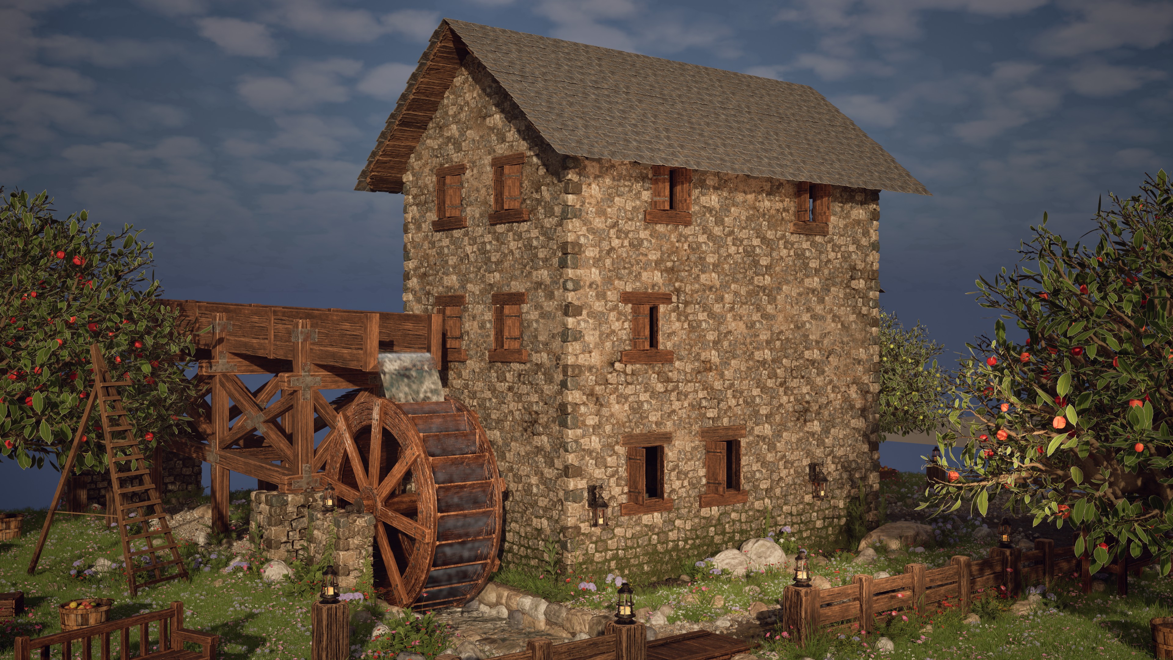 The scene is built around a stone mill and combines modular architecture, natural vegetation, and handcrafted props to create a realistic, game-ready environment. The project features modular brick walls, a terrain material based on height blending and Nanite tessellation, various harvest props (cart, barrels, crates, ladder, and baskets), and an orchard created with SpeedTree. To simulate the flowing water that powers the mill, I developed a Niagara VFX system with a custom material for both the river and the mill channel.