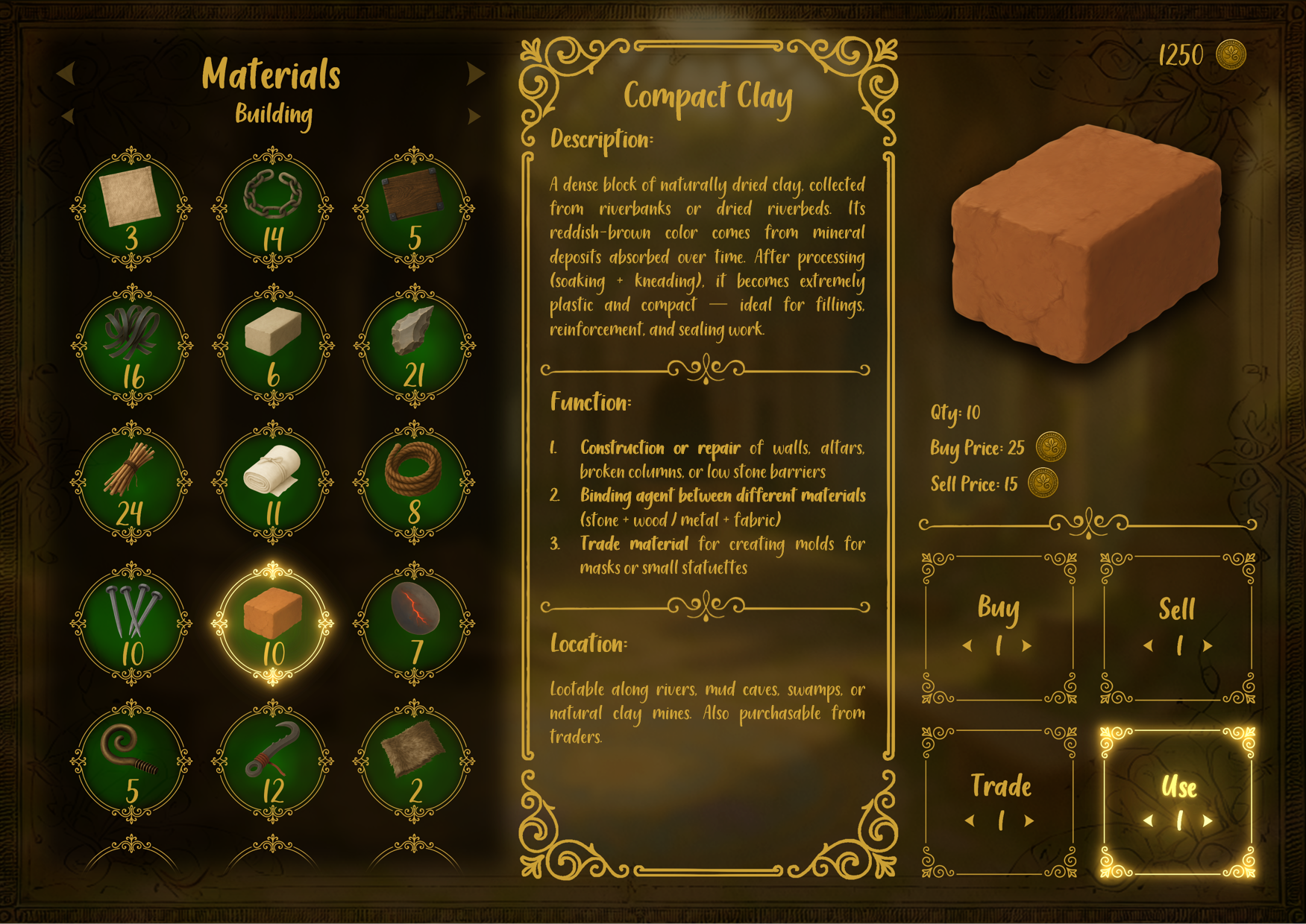 In the game world, Vaelis can gather and use a wide variety of resources, each defined by type and rarity (Common- Rare - Epic - Legendary). These elements are essential for character progression, inventory enhancement, and the acquisition of new upgrades.